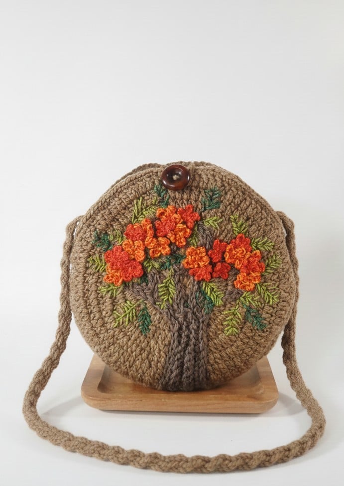 Una pieza de arte portátil. Esta exclusiva cartera redonda, tejida completamente a mano en crochet, captura la majestuosidad del árbol de Flamboyán.