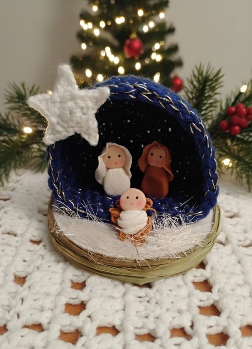 Esta pieza combina la calidez del crochet (en la cueva/gruta) con la dulzura de la porcelana fría (en el Divino Niño, la Virgen y San José). Un adorno único.
